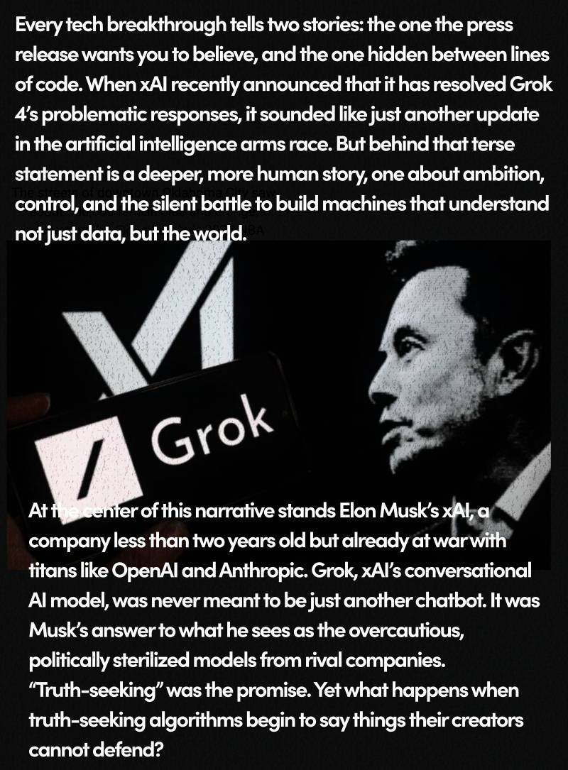Every tech breakthrough tells two stories: the one the press release wants you to believe, and the one hidden between lines of code. When xAI recently announced that it has resolved Grok 4’s problematic responses, it sounded like just another update in the artificial intelligence arms race. But behind that terse statement is a deeper, more human story, one about ambition, control, and the silent battle to build machines that understand not just data, but the world.